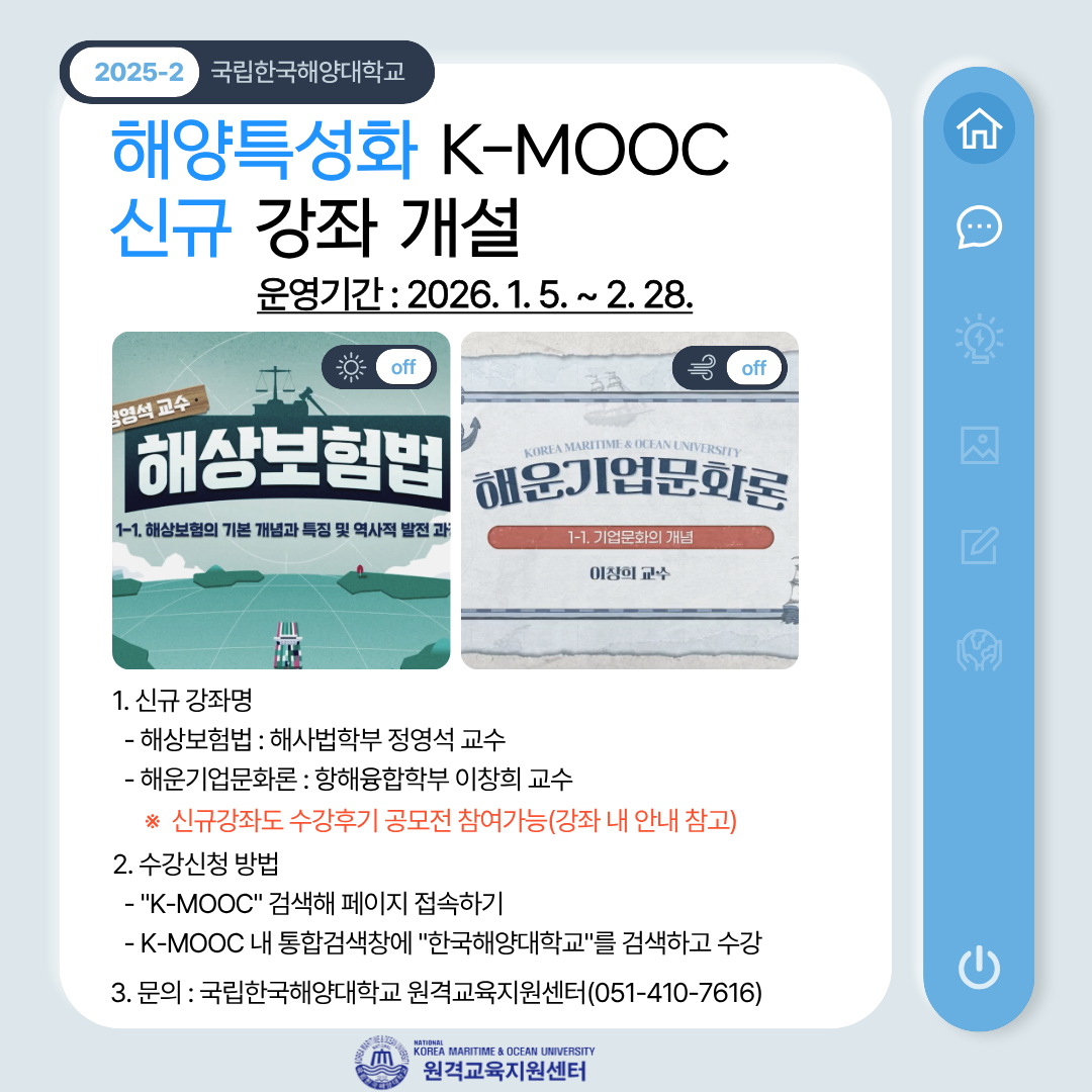 대 상 | 2025-2학기 국립한국해양대학교 해양특성화 K-MOOC강좌(9개 강좌) 이수자 |