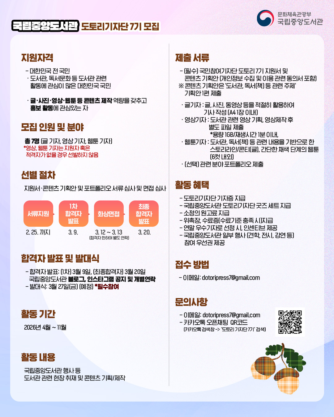 - [홍보] 2026년 국립중앙도서관 국민참여기자단 '도토리 7기' 모집 안내