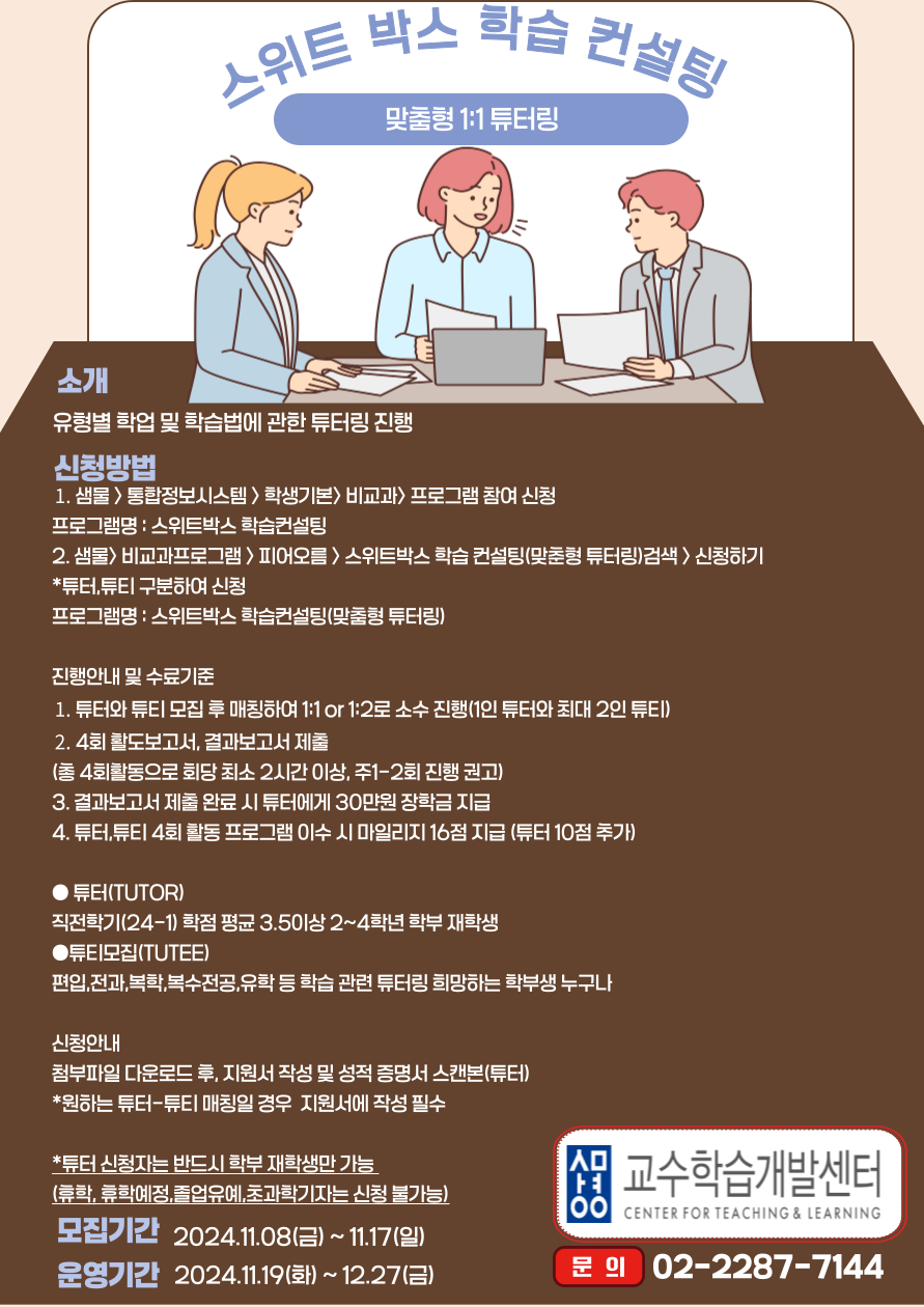 상명 [비교과] [교수학습개발센터(서울)] 2024학년도 2학기 스위트박스 학습컨설팅 맞춤형 1:1 튜터링 모집 안내 -