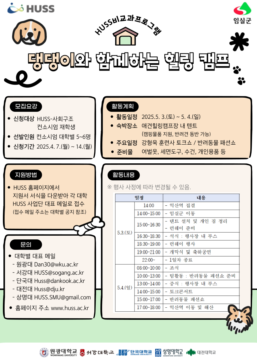 상명 [비교과] (기간연장) [HUSS 인문사회 융합인재양성사업단] 인문사회융합인재양성사업(HUSS) 「댕댕이와 함께하는 힐링캠프」 참가자 모집 안내 -